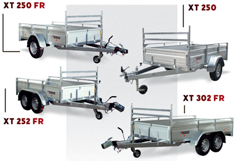 | XT | MMA (PTAC) ( | Charge utile (kg) | Poids à vide (kg) | Dim. hors tout (c | Dim. utile (cm) | Volume utile (m3 | Ridelles grillagée | Vol avec ridelles | Hauteur | Charge essieu | Roues | Roue jockey (diam. 60 escamotable) |